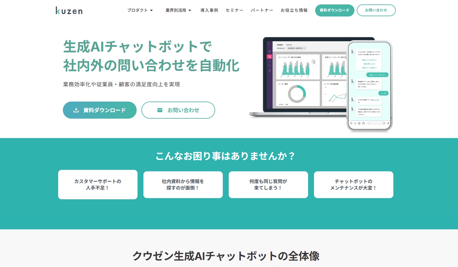 KUZENは、株式会社クウゼンが提供するノーコード対話AIプラットフォームです。独自のRAGアーキテクチャで正確な回答を実現しつつ、PDF・Word・Excel・Webサイトなど多様なデータ形式をそのまま読み込めます。LINE・Slack・Microsoft Teamsなどマルチチャネルに対応しており、顧客接点と社内コミュニケーションの両方を1プラットフォームで運用できます。