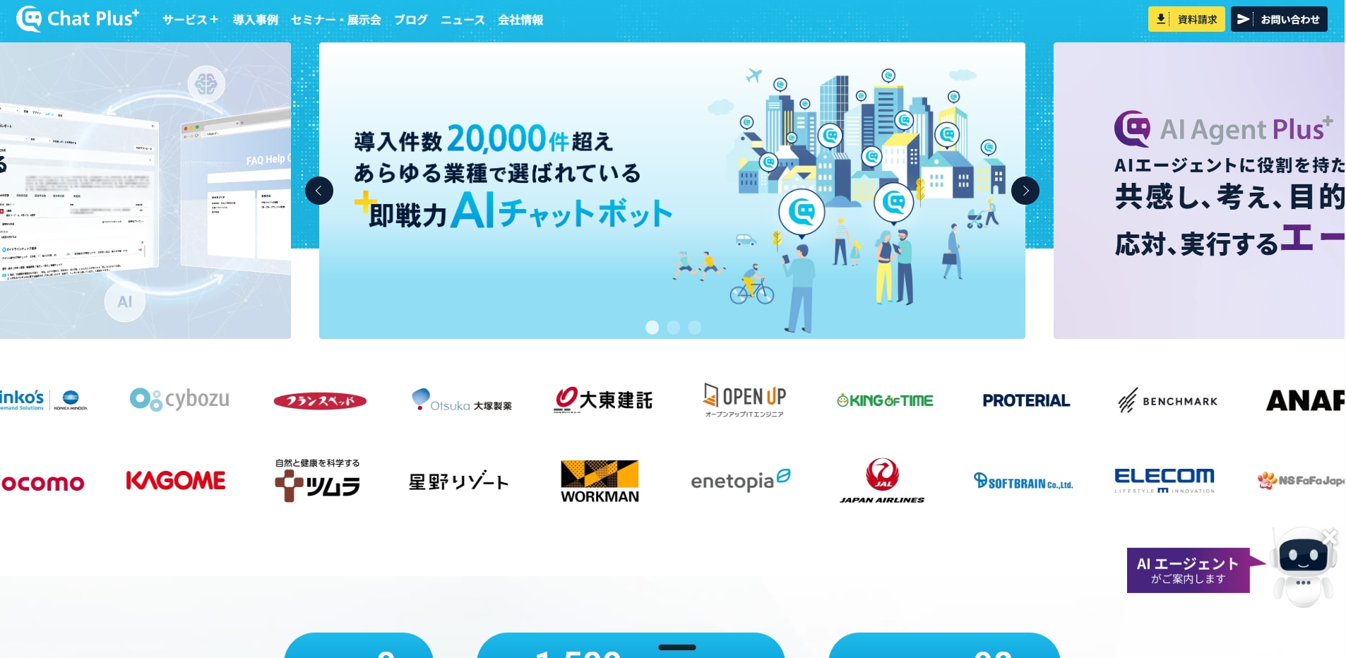 ChatPlusは、チャットプラス株式会社が提供するAIチャットボットサービスです。月額1,500円(税抜)〜という業界最安水準の価格帯で、シナリオ型・AI型・有人チャットのすべてを1つのツールで完結できる点が強みです。