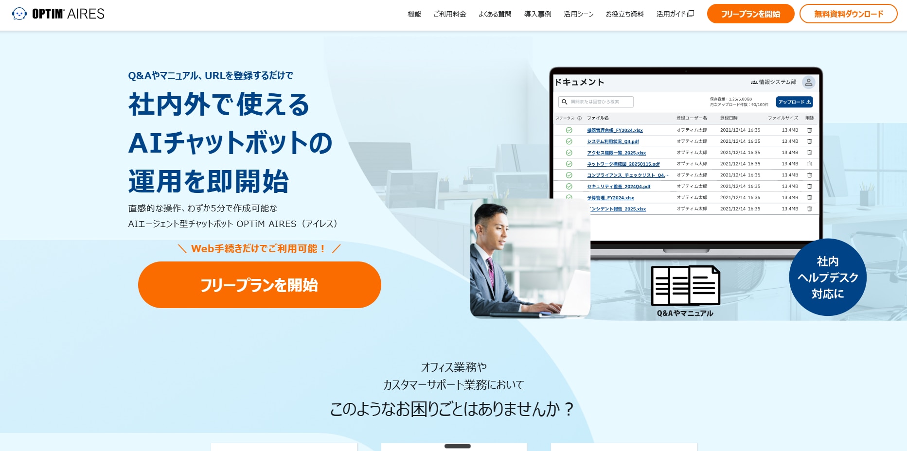 OPTiM AIRES | フリープラン0円/ライト5万円〜(税抜) | 永年無料フリープラン | RAG型 |