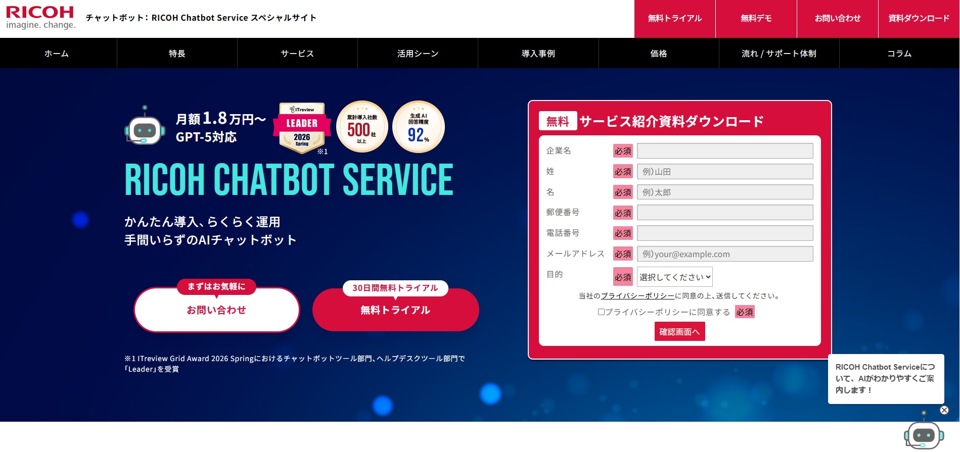 RICOH Chatbot Service | 月額1.8万円(税抜)〜 | 30日間無料トライアル | シナリオ+AI+生成AI |