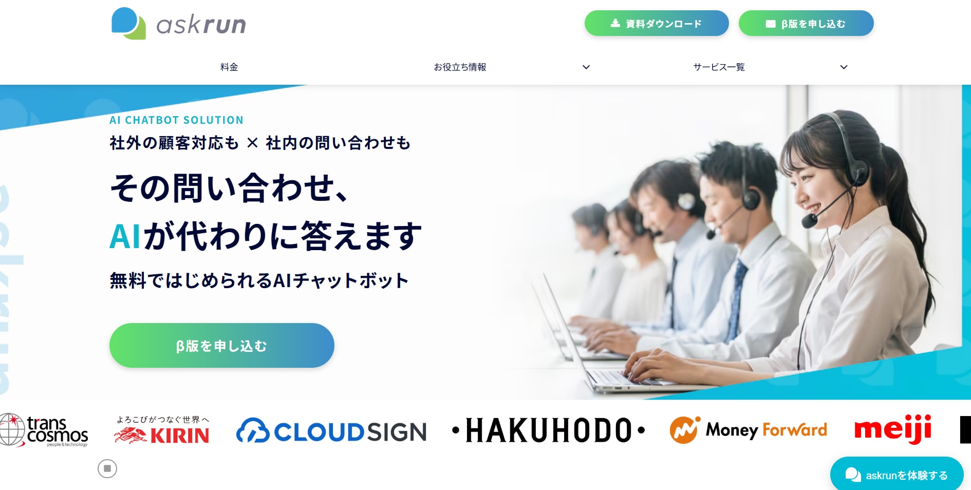 askrun | 無料プラン(継続利用可) | 5プラン | 社外/社内 両対応 |