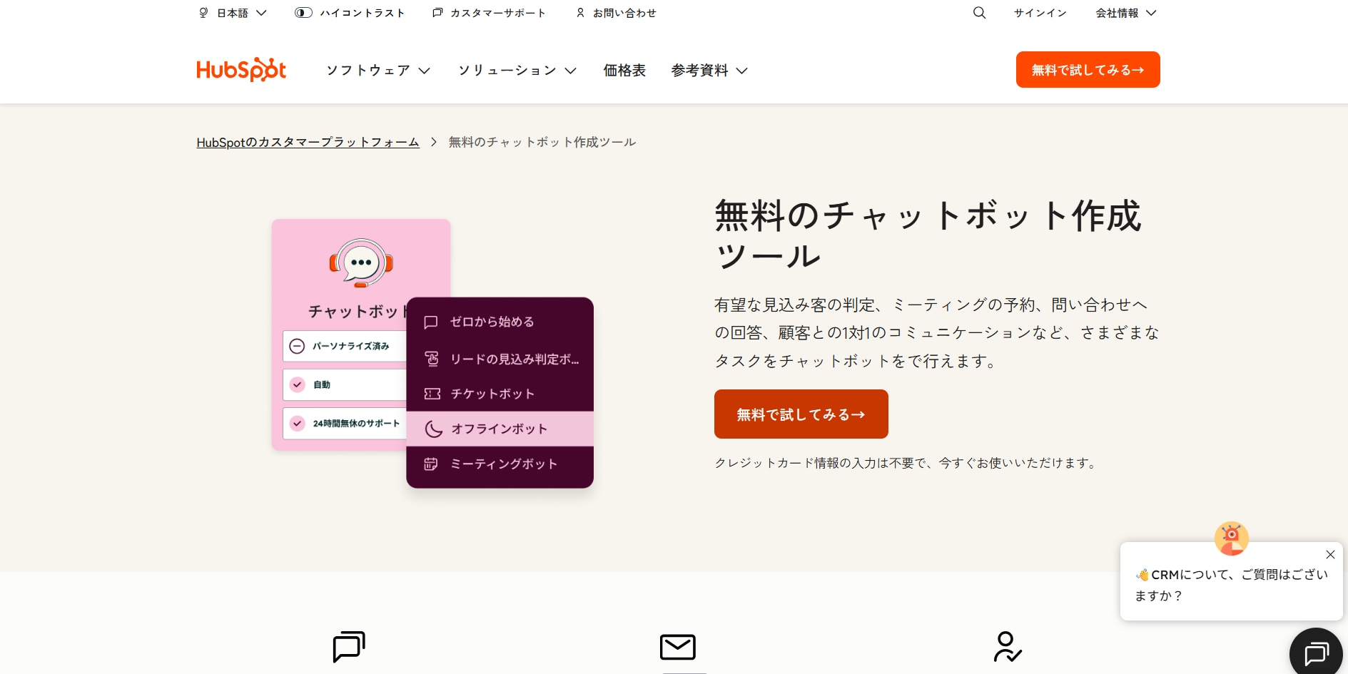 HubSpotのチャットボット作成ツールは、クレジットカード登録不要で無料から始められるのが特徴。CRM・Marketing Hubと統合されており、チャットボットで獲得したリード情報がそのまま顧客データベースに蓄積されます。
