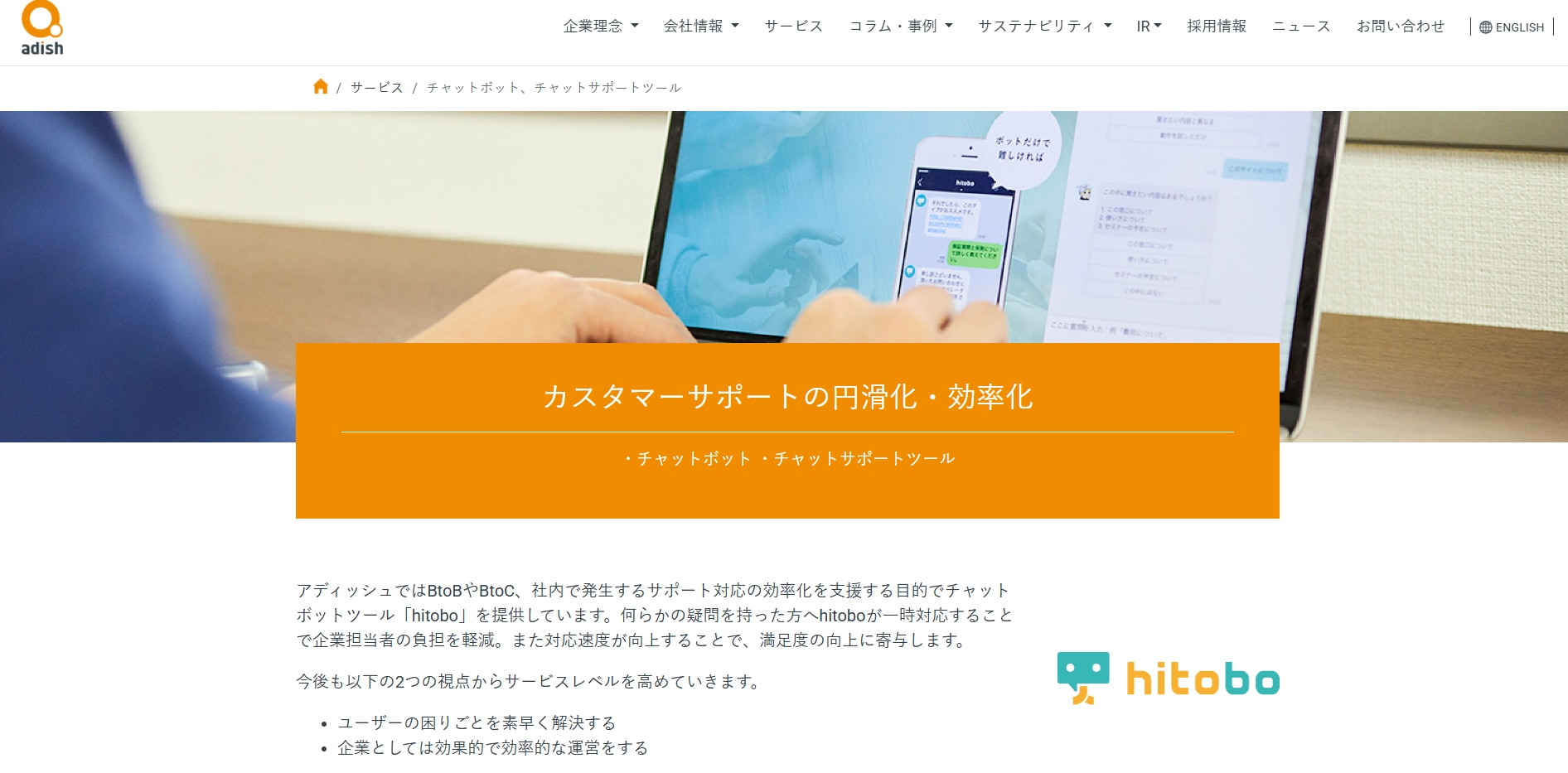 hitoboは、アディッシュ株式会社が提供する生成AI型チャットボット。最大の特徴は、URL・PDF・Word・Excel・PowerPointなどの自社データを登録するだけで、ChatGPT(GPT-4o mini)がQ&Aを自動生成してくれる点にあります。
