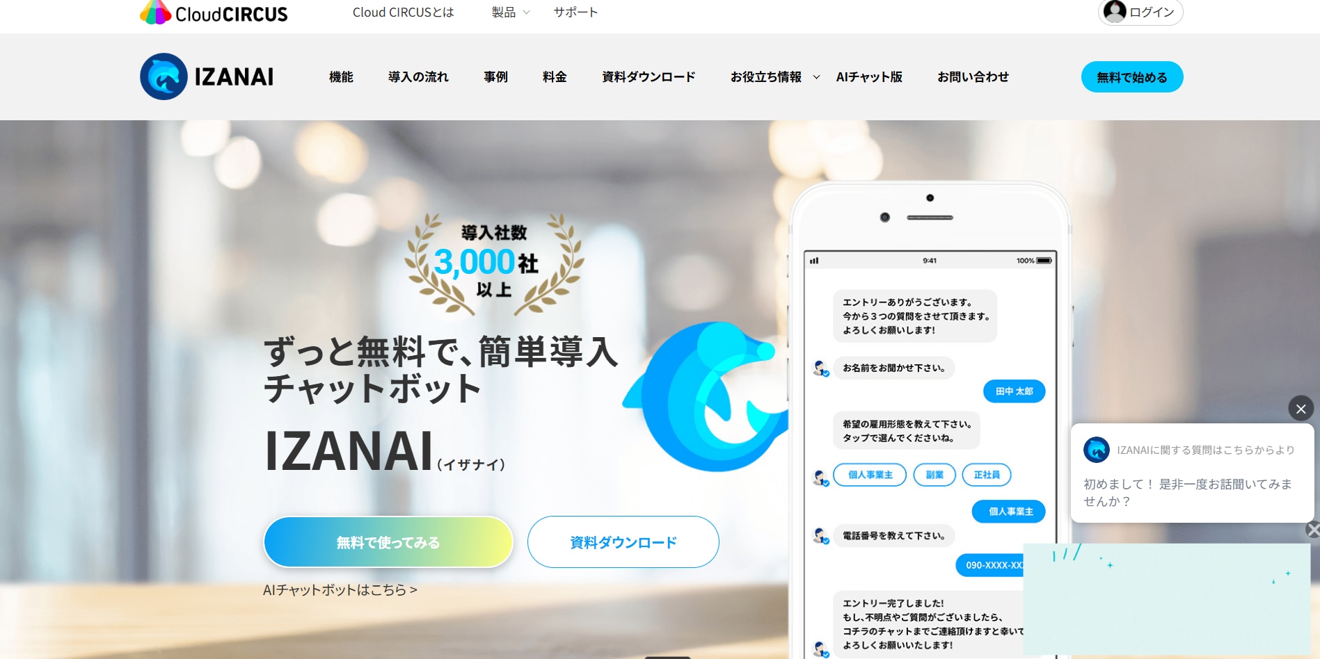 IZANAIは、クラウドサーカス株式会社が提供するWeb接客型チャットボット。期間制限なしのフリープランがあり、チャットボットを1つ無料で作成・公開できる点が大きな魅力です。