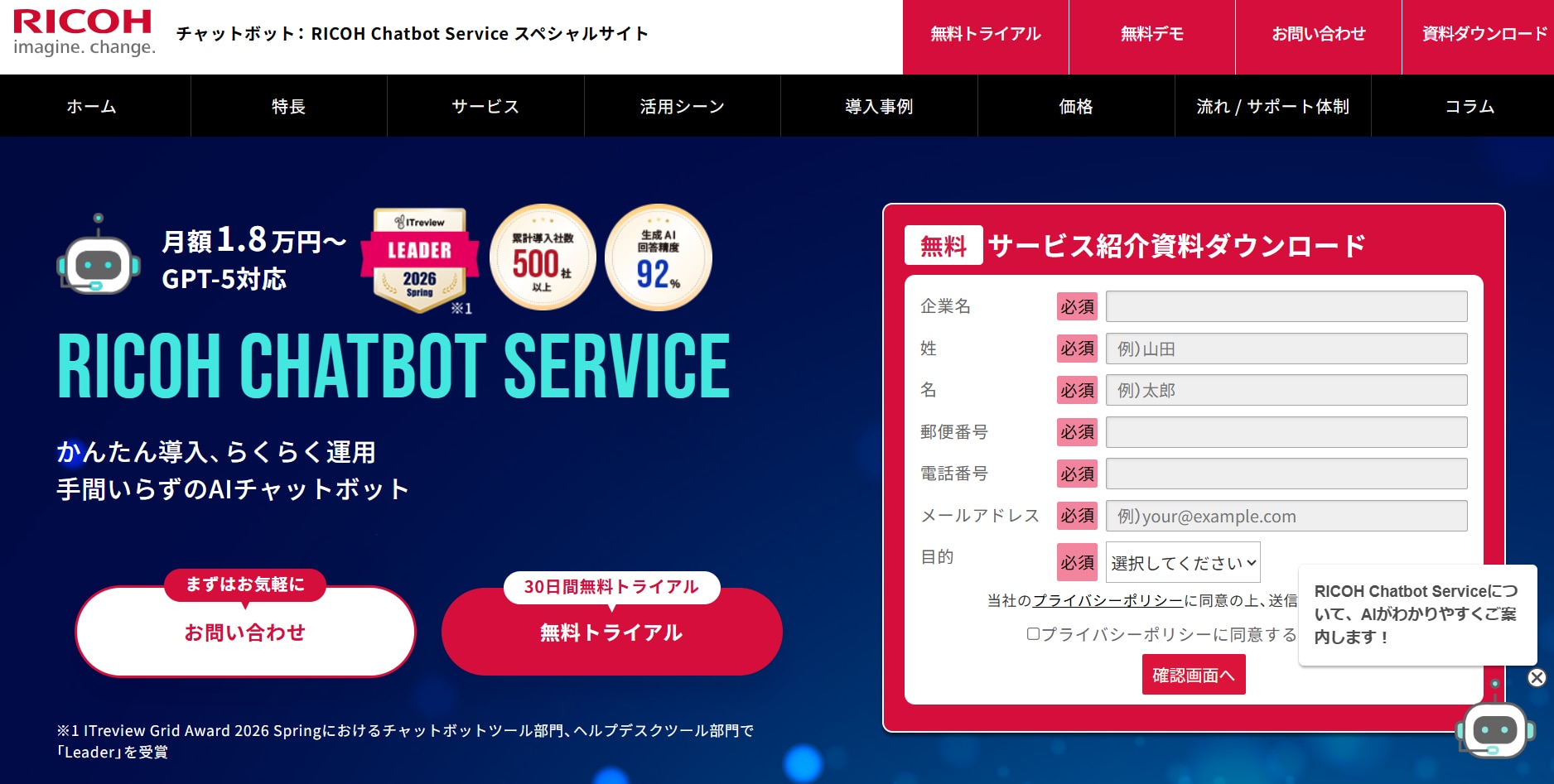 RICOH Chatbot Service(30日間無料トライアル・リコー提供の信頼性とAI型4プラン)