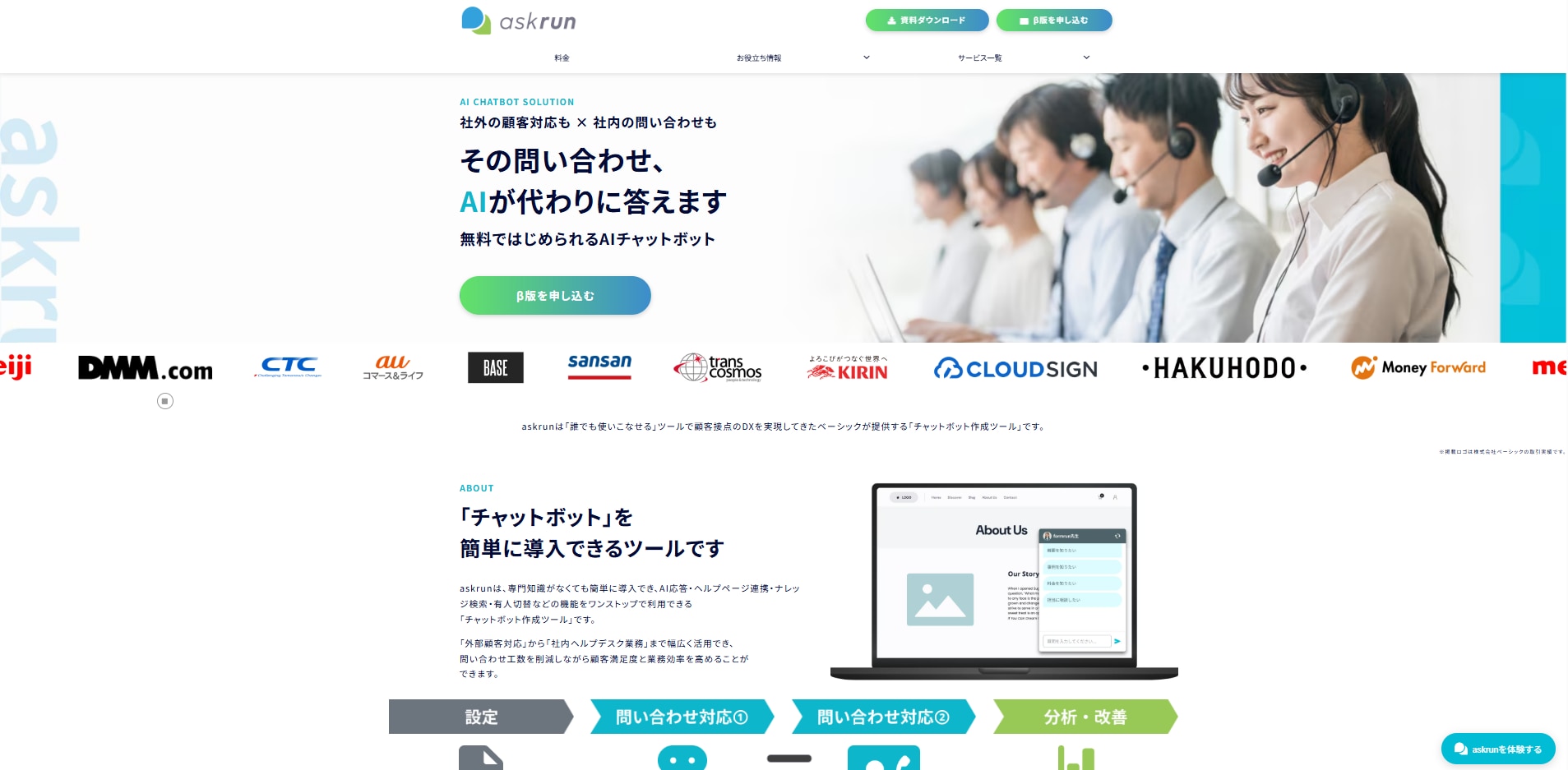 askrunは、株式会社ベーシックが提供するAIチャットボットサービスです。RAG(検索拡張生成)技術を活用し、企業が持つナレッジやヘルプページをアップロードするだけで、AIが問い合わせに自動で応答します。