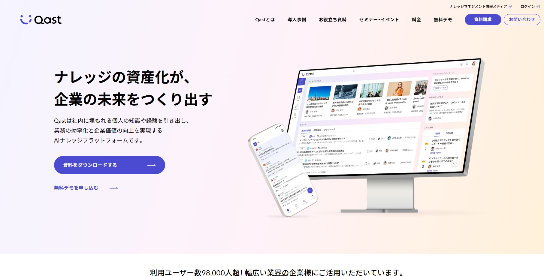 Qastは、any株式会社が提供するナレッジマネジメントプラットフォームです。5,000社以上の導入実績があり、引き出し型のQ&A・自主投稿型のメモという独自の仕組みで、社内の知の循環を促します。